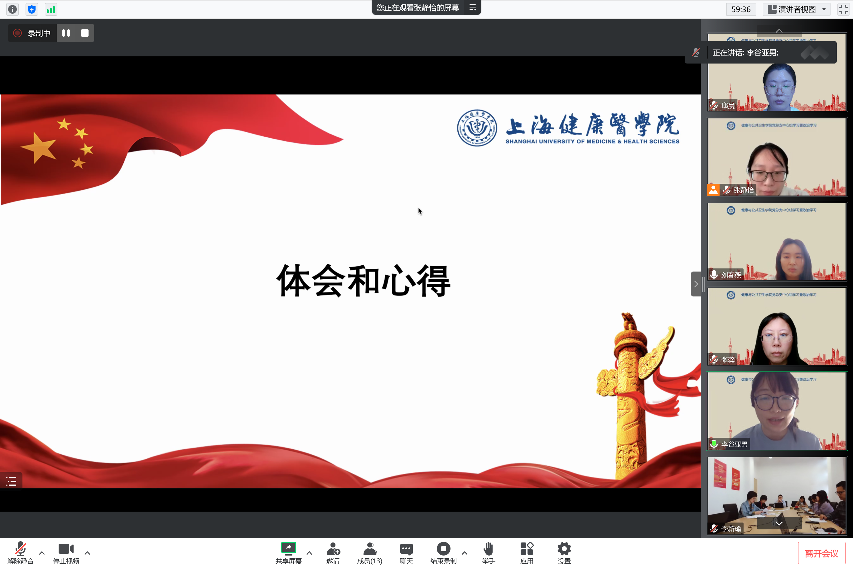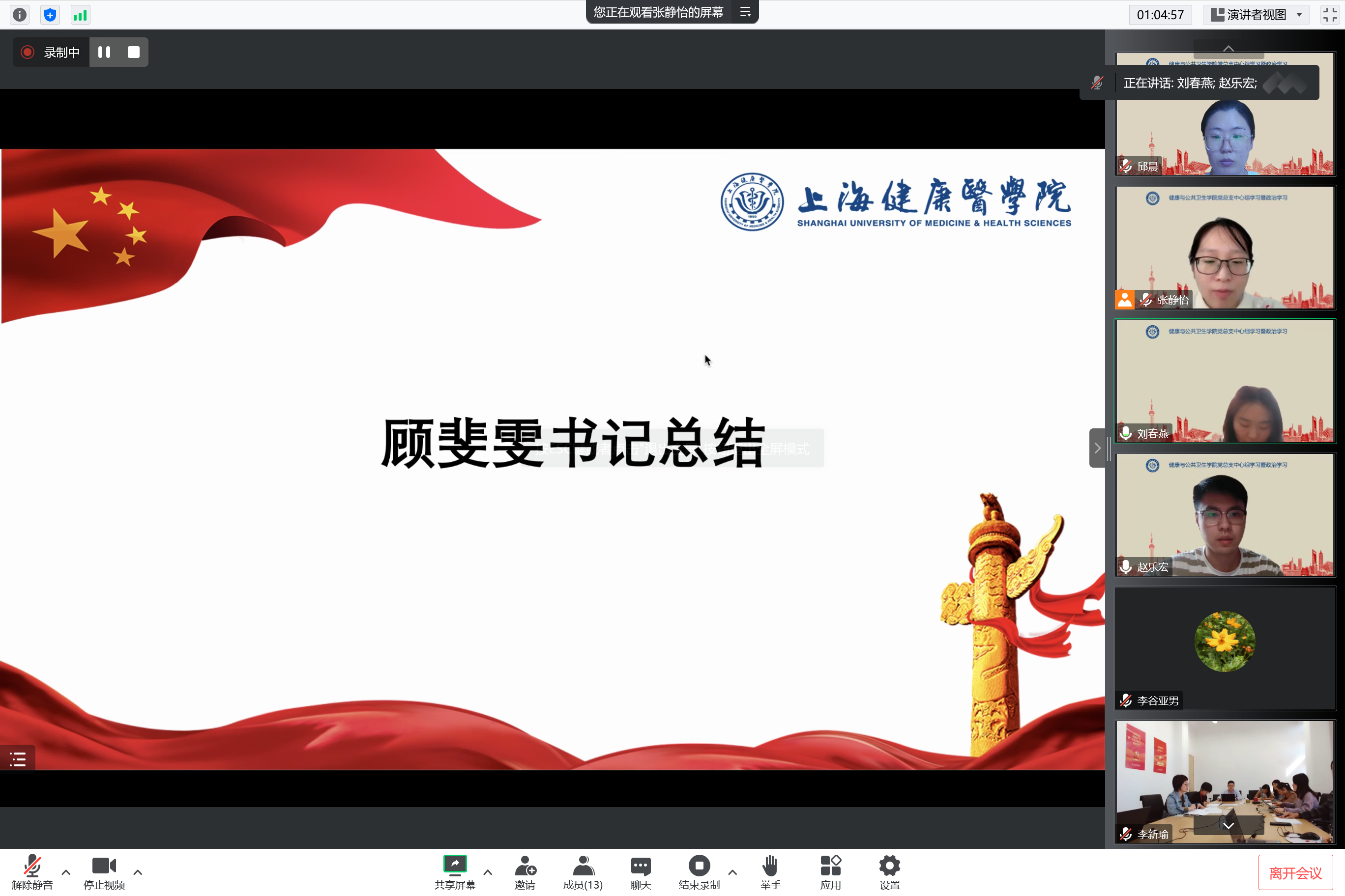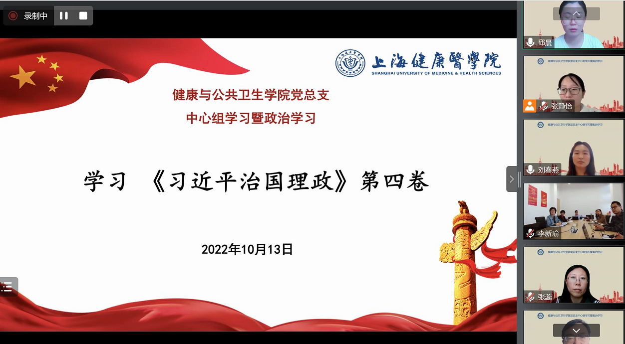 2022年10月13日,健康与公共卫生学院党总支召开了中心组学习暨政治学习,学习活动主题是学习《习近平谈治国理政》第四卷。会议由顾斐雯书记主持,全体党员和群众参加。