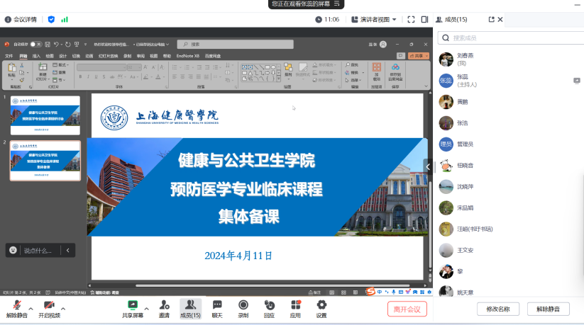 为了增强附属医院教师的教学能力和教学水平,提高预防医学专业教学质量, 2024411日下午,附属崇明医院开展了预防医学专业临床课程集体备课活动。上海交通大学医学院教务处处长钮晓音、上海市同仁医院肾内科副主任朱鼎玉、上海健康医学院临床医学院专业主任李晨蕾作为专家出席了本次活动。崇明医院相关领导和教师团队、上海健康医学院预防医学专业相关教师等参加了此次活动。
