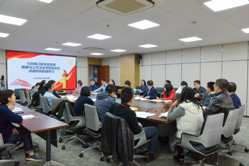 2020年12月10日中午12:00行政第三联合党支部全体教职工、健康与公共卫生学院全体教职工在北苑一号楼902会议室开展了师德师风联组学习。